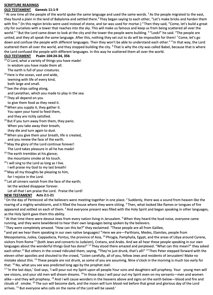 Scripture Psalm 104:24-34, 35b John 7:37-39 John 20:19-23 Acts 2:1-21