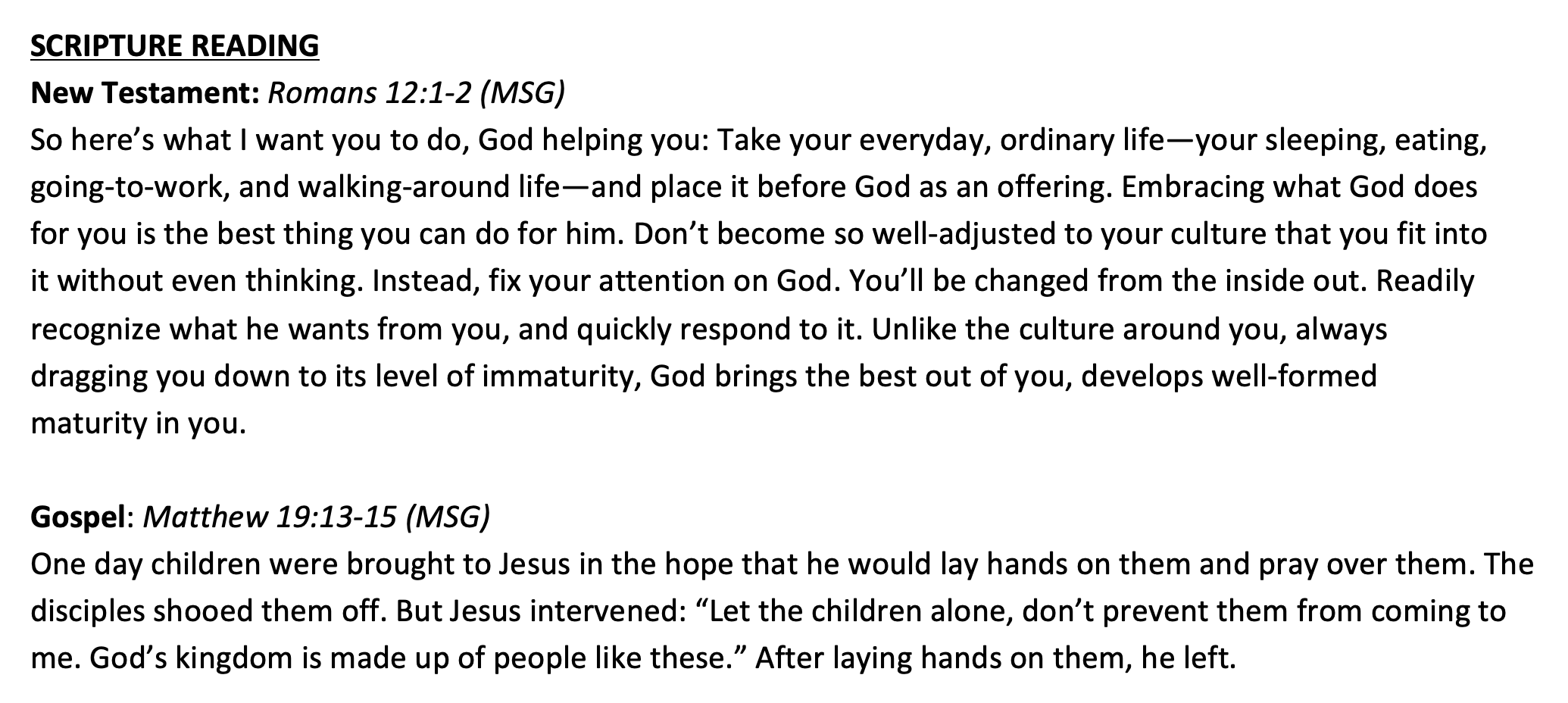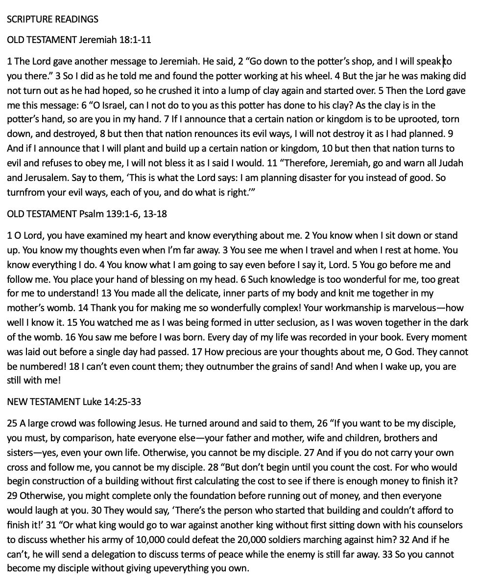Scripture Psalm 105:1-6 Romans 12:9-21 Matthew 16:21-28