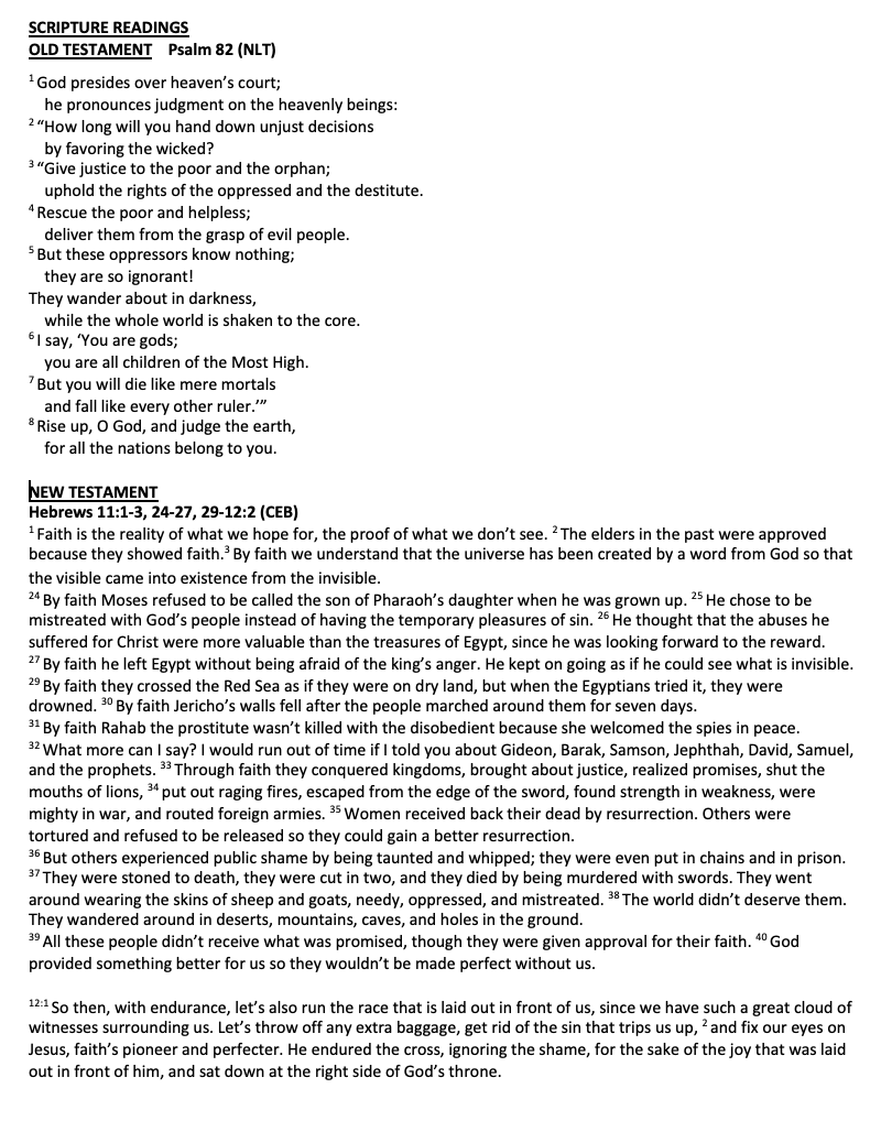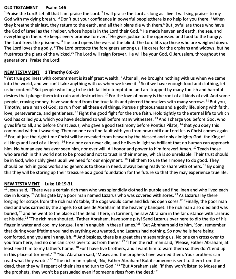 Scripture Proverbs 22:1-2, 8-9, 22-23 (NLT) James 2:1-10, 14-17 (NLT) Mark 7:24-37