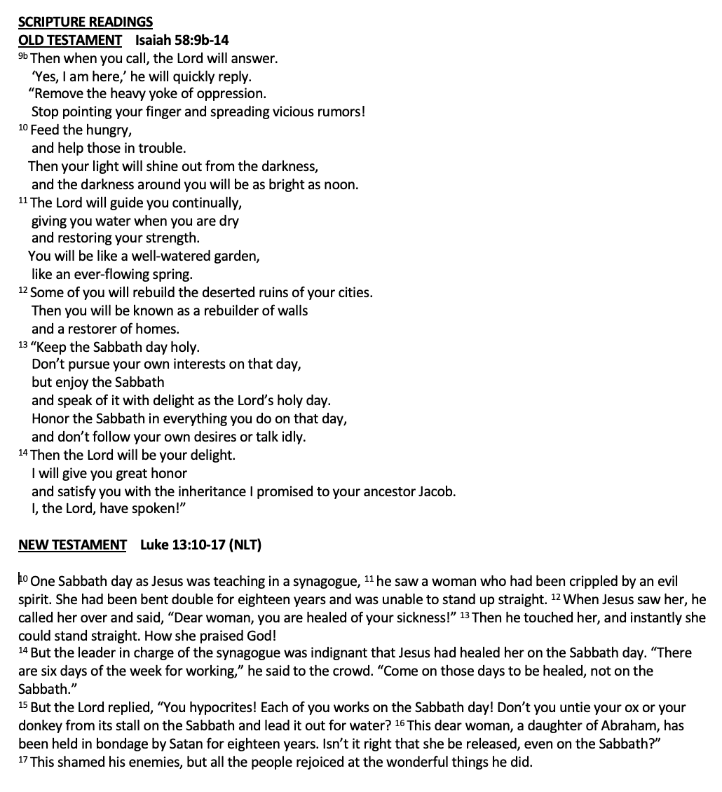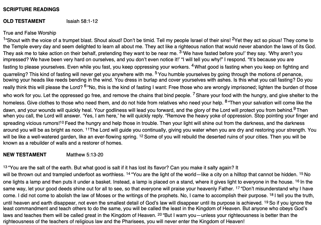 Scripture Isaiah 58:1–12 Matthew 5:13–20