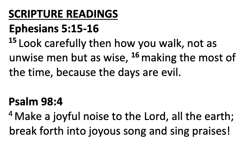 Scripture II Samuel 6:1-6, 12b-19 Ephesians 1:3-14 (The Message)