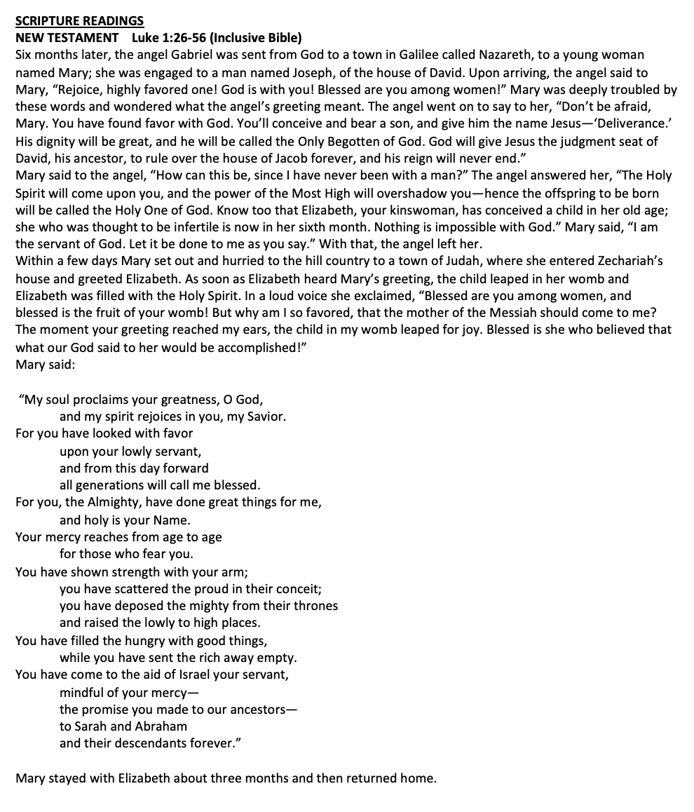 Scripture Luke 1:39-55 (Mary, Elizabeth, Magnificat)
