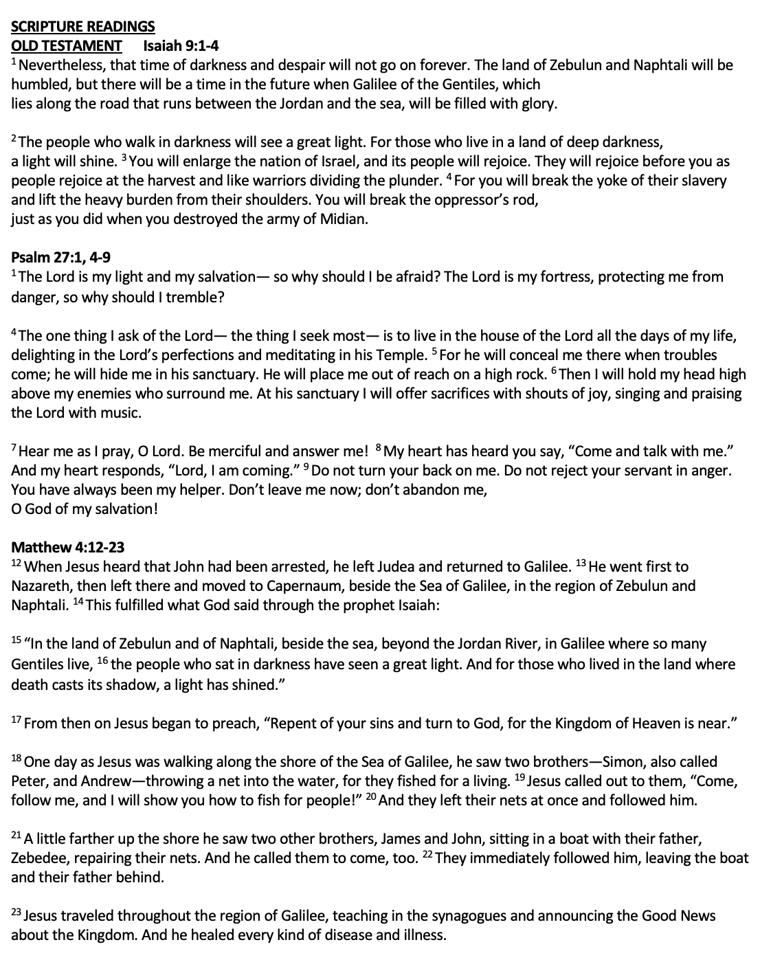 Scripture Isaiah 9:1-4 Matthew 4:12-23