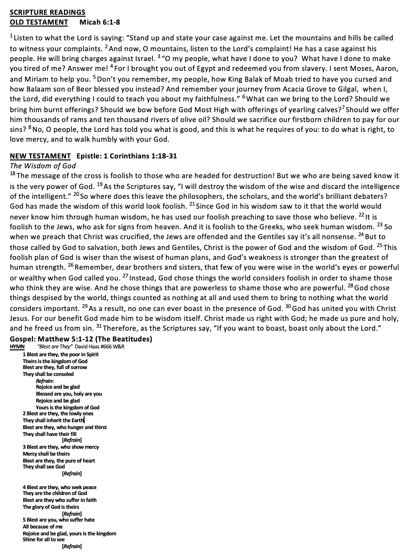 Scripture 1 Corinthians 1:18-31 Matthew 5:1-12
