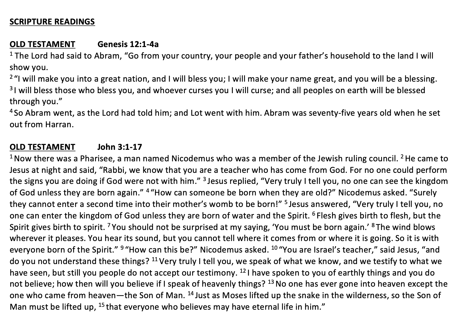 Scripture Genesis 12:1-4a Romans 4:1-5, 13-17 John 3:1-17